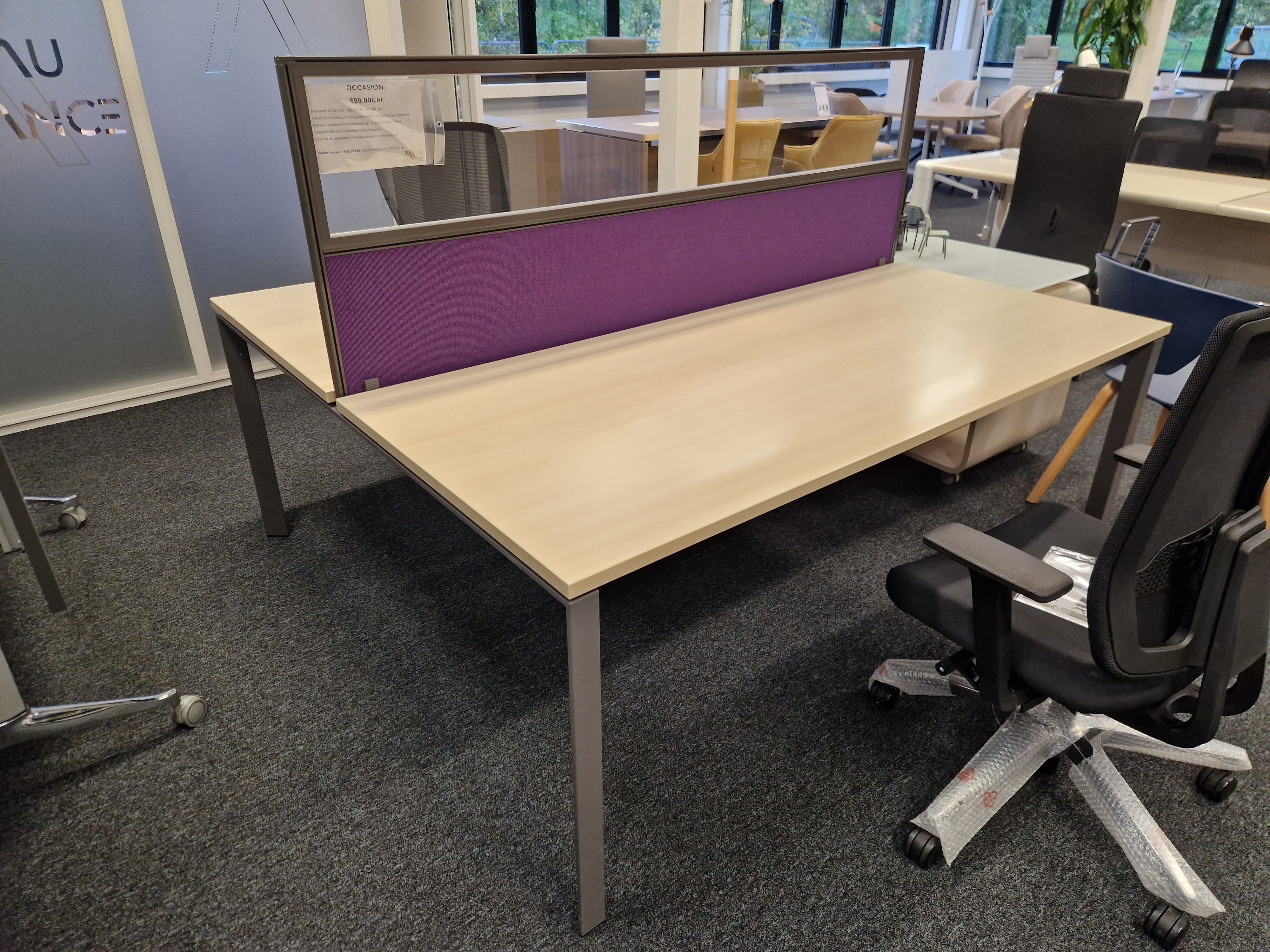 Ensemble vis-à-vis L. 180 x P. 161cm (80+80). Piètement métallique biseauté ouvert finition époxy Graphite. Plateaux coulissants mélaminés ép. 25 mm finition Hêtre. Goulotte métallique finition époxy Graphite. Cloison de séparation 2 niveaux.